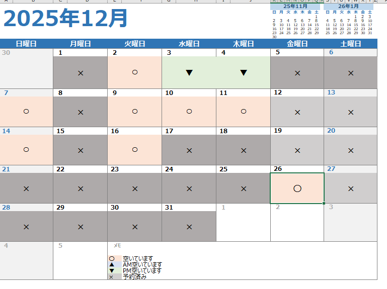 calender 〇空いてます ▲午前空いてます▼午後空いてます